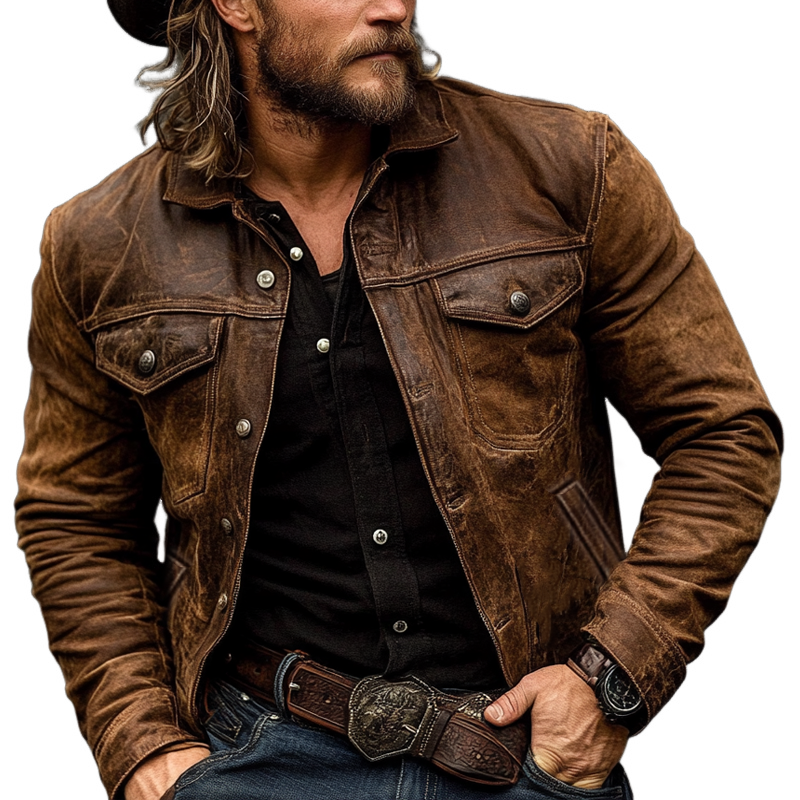 Men's Vintage Brown Distressed Leather Multi-Pocket Lapel Jacket