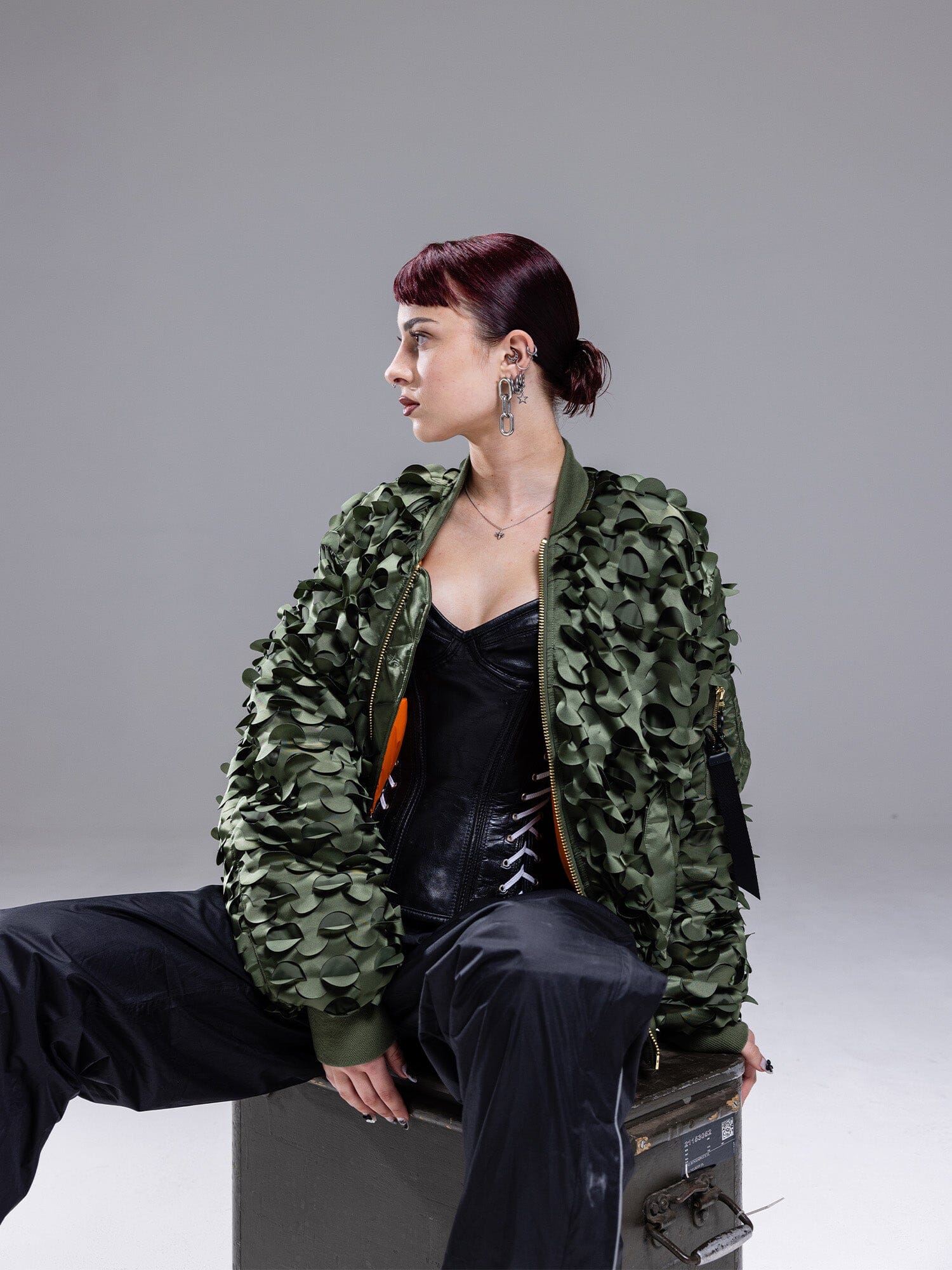 Inspired by the ultra lightweight camouflage net system (Ulcans), the jacket features laser-cut camo panels, magnetic closures, and a utility pocket enhanced with carabiner hooks. Whether disappearing into the environment or commanding attention, the MA-1 Ulcans embodies the collection's ethos: Versatile Design.