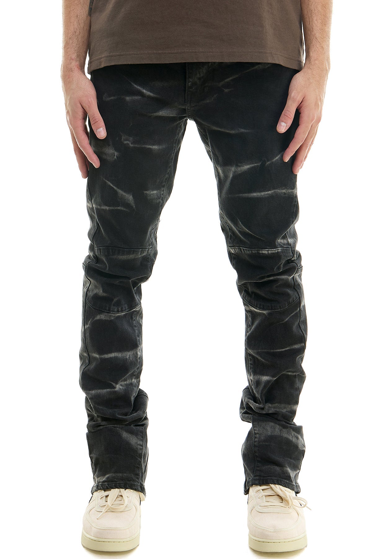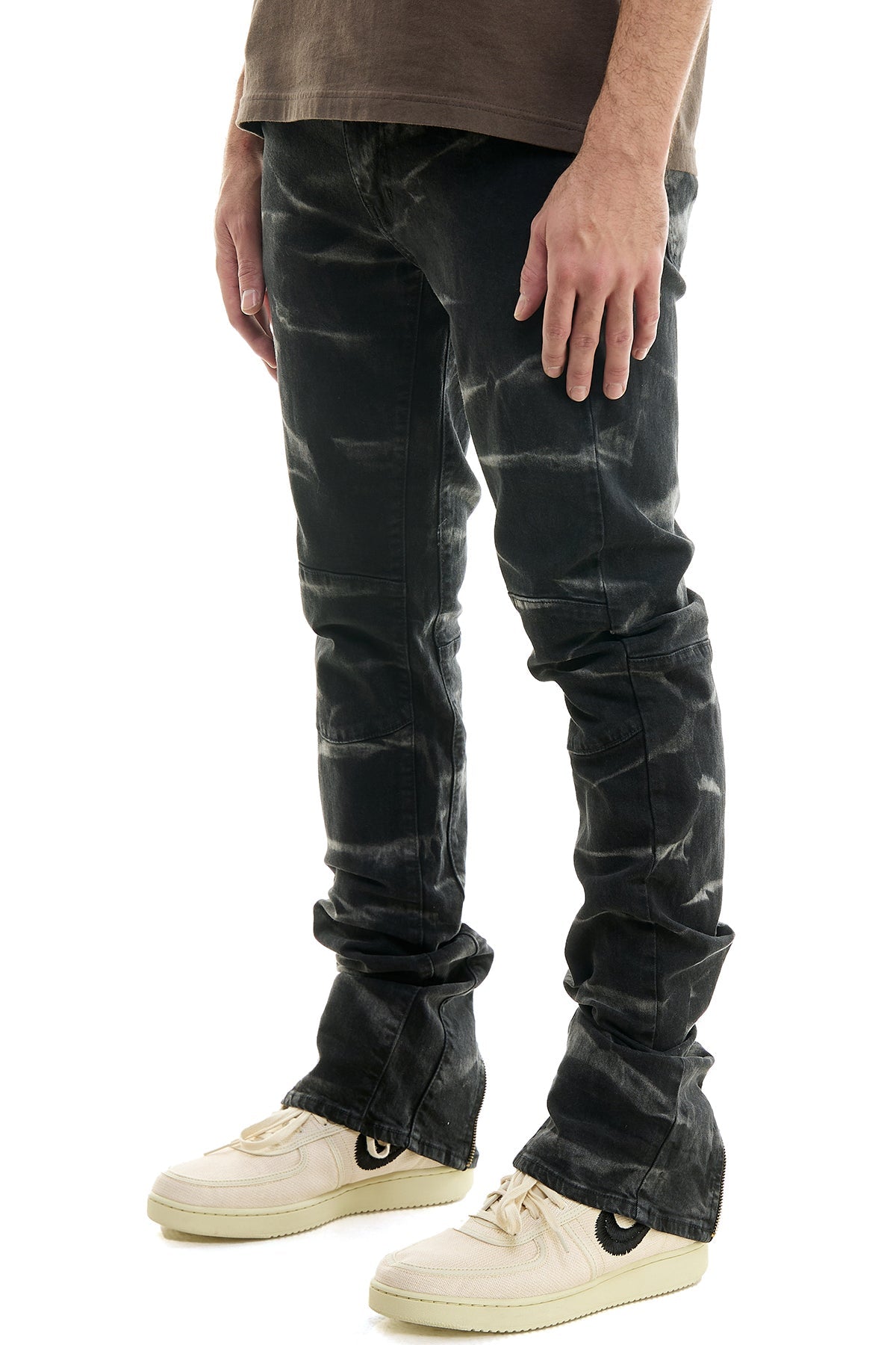 Men's stacked jeans with long zippers in the back of the bottom parts offer a unique flared look. These jeans feature a 5-pocket design, combining style and functionality. The long zippers can be adjusted to achieve the desired flare, adding a modern twist to the classic denim style.
