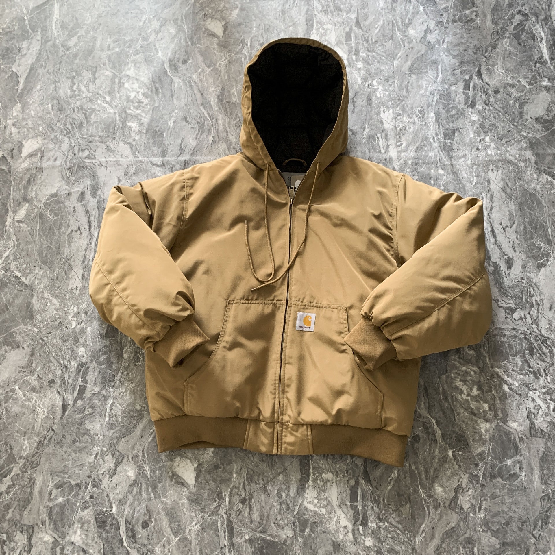 This Carhartt outdoor coat is designed to tackle the elements while providing superior warmth. The exterior is crafted from a durable nylon fabric that is both stain-resistant and waterproof, ensuring protection in various weather conditions. For insulation, the coat is generously filled with lightweight yet effective down cotton padding. It features a practical hooded design and a secure zip-up front, making it a reliable choice for cold, wet outdoor activities