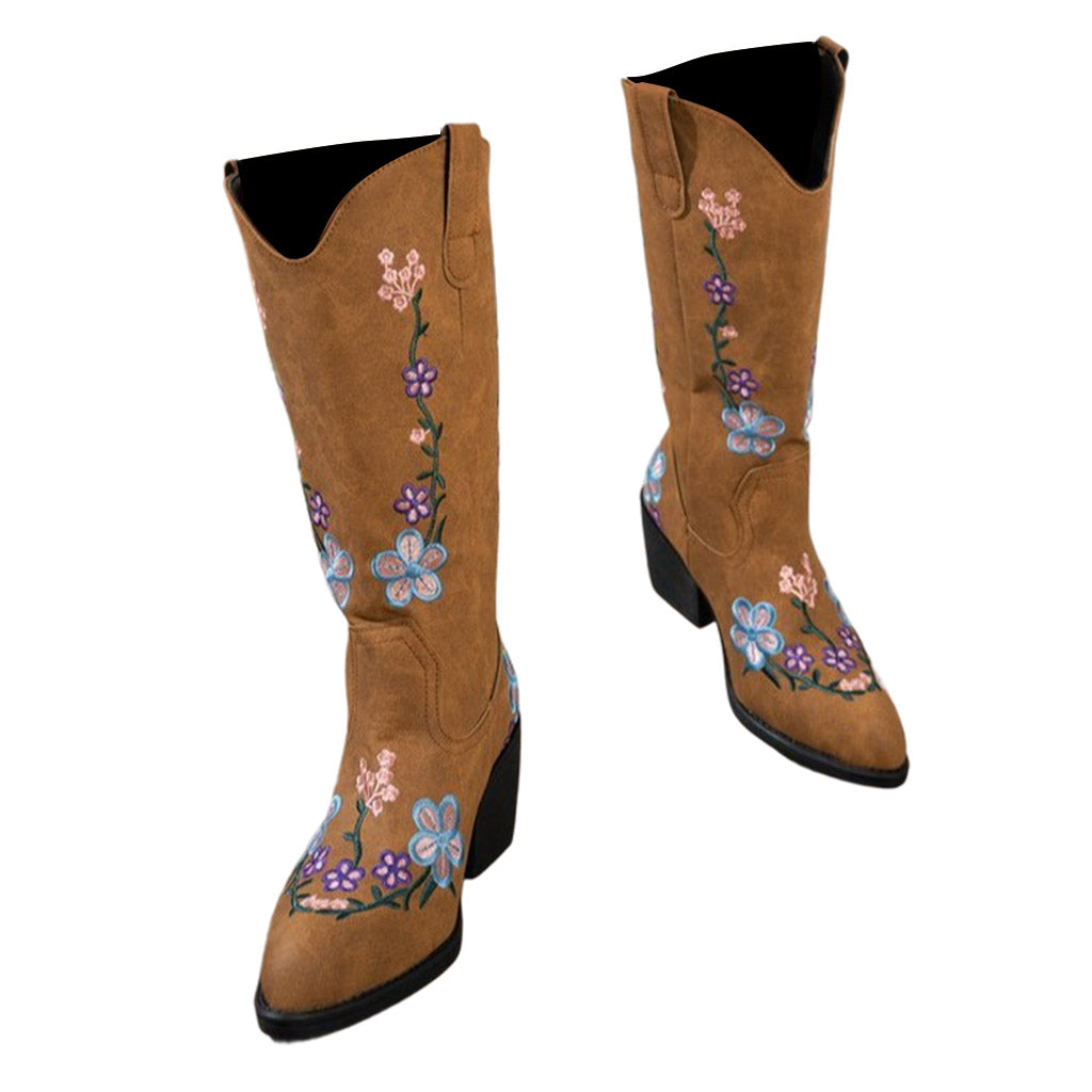 Women's Western Cowgirl Leather Floral Embroidered Mid-calf Solid Color Thick Heel Knight Boots